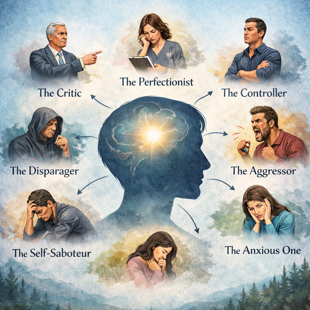 In childhood, when we encounter criticism, comparison, neglect, emotional unpredictability, abuse, or trauma, the psyche adapts by creating protective parts. These parts are not “bad.” They are intelligent and loyal. The perfectionist may have developed to avoid rejection. The anxious part may have learned to anticipate danger before it arrives. The aggressive part may have emerged when no one else protected you. The submissive part may have discovered that staying small felt safer.